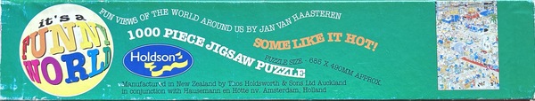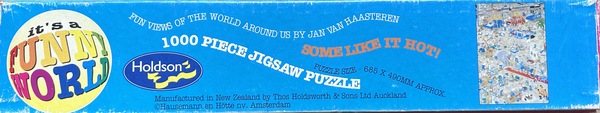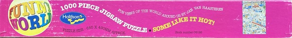 | Opis | Ta łamigłówka jest częścią zestawu czterech łamigłówek wydanych przez nowozelandzkiego producenta łamigłówek Holdson Funny World (HFW)Ta układanka ma numer 08126, podobnie jak trzy inne układanki w tym zestawie. Aby uzyskać więcej informacji na temat całego zestawu, odwiedź stronę „Puzzle Holdsona Funny World 08126Ta łamigłówka jest rzadka, ponieważ wszystkie zostały wydane w Nowej Zelandii. Jest to również bardziej przedmiot kolekcjonerski, ponieważ wszystkie plansze/rysunki z tych łamigłówek zostały wydane również w wersji Jumbo w Holandii. Istnieje zestaw starszych łamigłówek wydany przez Holdson Funny World — i wszystkie te pudełka wyglądają inaczej niż obecne, rozpoznawalne niebieskie pudełka z łamigłówkami Jumbo. Wiele z tych pudełek ma wiele jaskrawych kolorów. Łącznie 48 z tych starszych łamigłówek zostało wydanych przez Holdson Funny World (HFW), dlatego są one rzadsze. Rzadko można zobaczyć te łamigłówki na rynkach takich jak Marktplaats. Naprawdę trzeba poszukać na platformach handlu używanymi łamigłówkami w pobliżu Nowej Zelandii i Australii. Wada: jeśli chcesz kupić jedną, musisz zapłacić wysokie cła importowe, a łamigłówka często dociera długo. Do dziś łamigłówki Jana van Haasterena są nadal publikowane w znajomym niebieskim pudełku. Te łamigłówki w znanych niebieskich pudełkach NIE są rzadkie; Można je łatwo zamówić w sklepie internetowym w Nowej Zelandii. Ta układanka „Some Like it Hot” o numerze 08126 jest rzadka. Ilustracja jednak nie, ponieważ „Some Like it Hot” została wydana również przez inne marki, takie jak Jumbo. Jej wydanie przez HFW czyni ją rzadką i często natychmiast staje się przedmiotem kolekcjonerskim. Jest dostarczana w pięknym, kolorowym pudełku z czterema kolorami po bokach: niebieskim, zielonym, czerwonym i różowym. Tył pudełka pokazuje, które cztery układanki należą do „zestawu” o numerze 08126. |